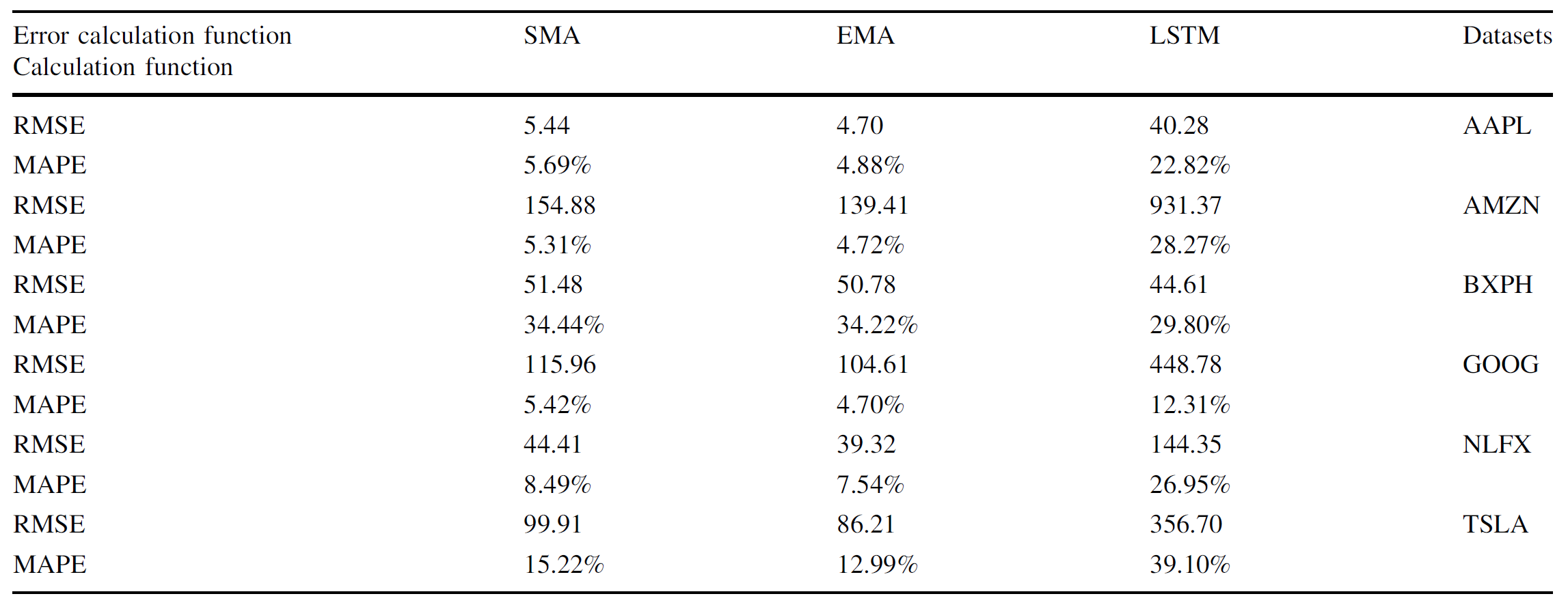 EMA consistently beat other methods across various stocks (AAPL, AMZN, GOOG, TSLA, etc.)