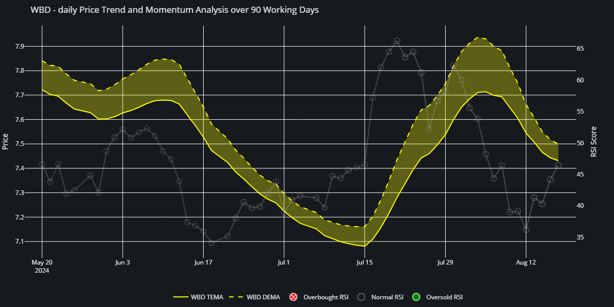 RSI and ADX: The RSI has been all over the place, dipping into oversold territory (below 30) in mid-June and flirting with overbought levels (above 70) in mid-July. As of August 16, it's sitting at a lukewarm 46.42. It's like the market can't make up its mind about WBD. ith an ADX hovering around 17.80, we're looking at a weak trend. Typically, we want to see ADX above 25 for a strong trend.