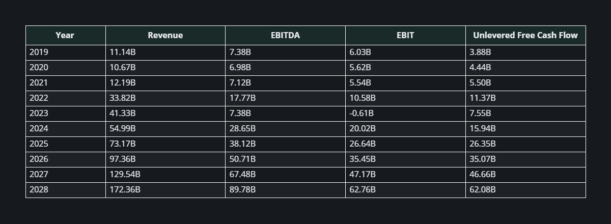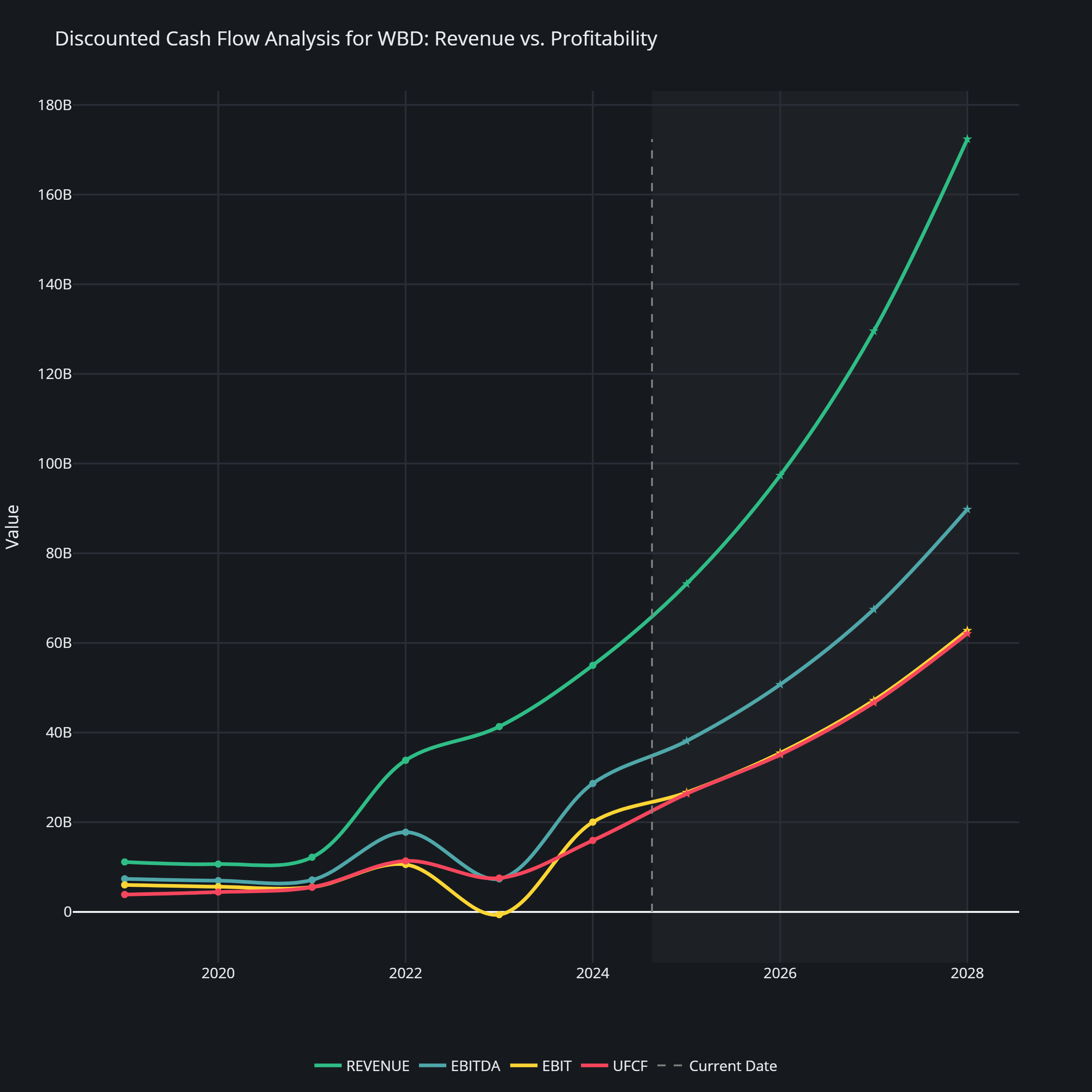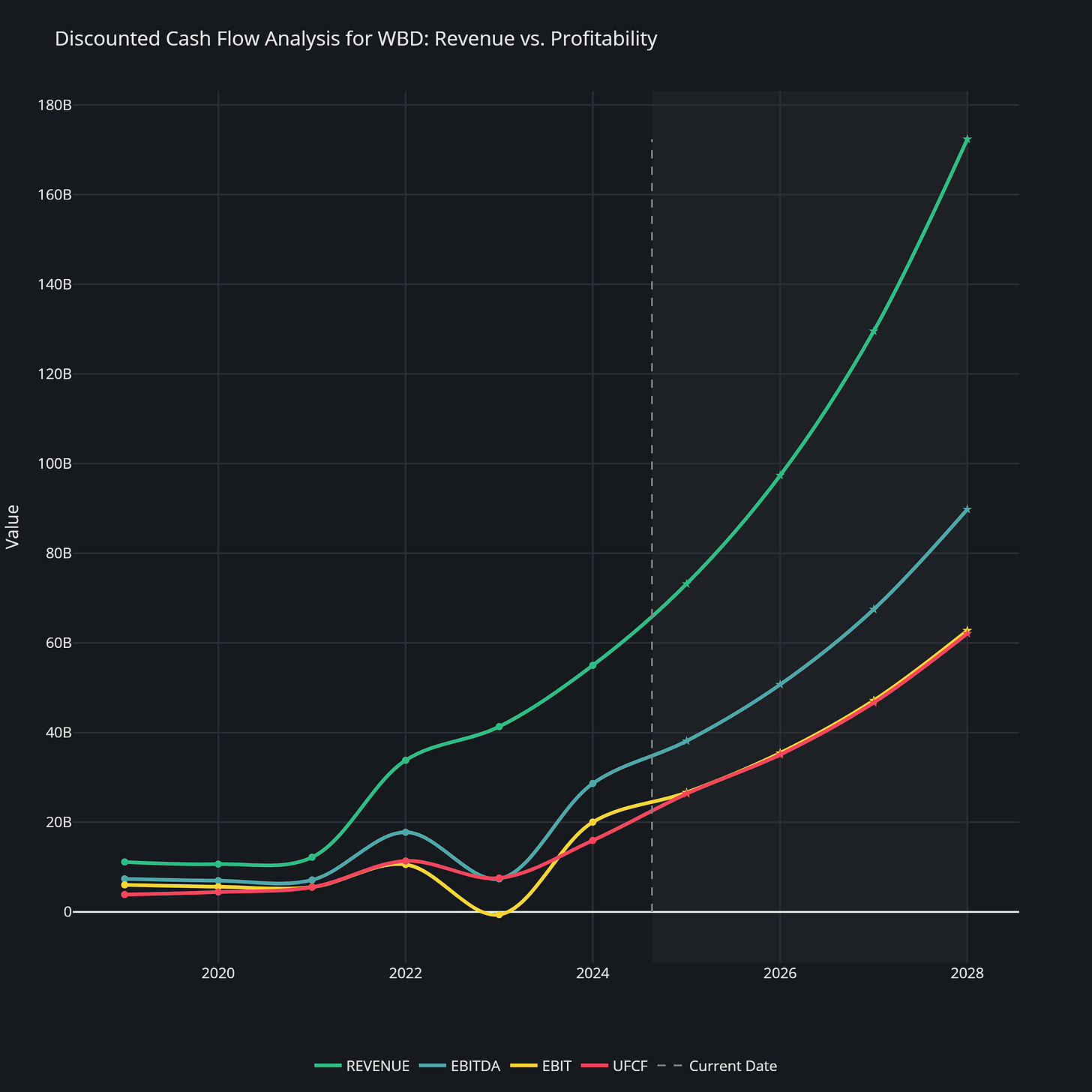 EBIT: WBD is projecting to go from a loss of $0.61B in 2023 to a profit of $62.76B in 2028. If they pull this off, it'll be the comeback of the century.