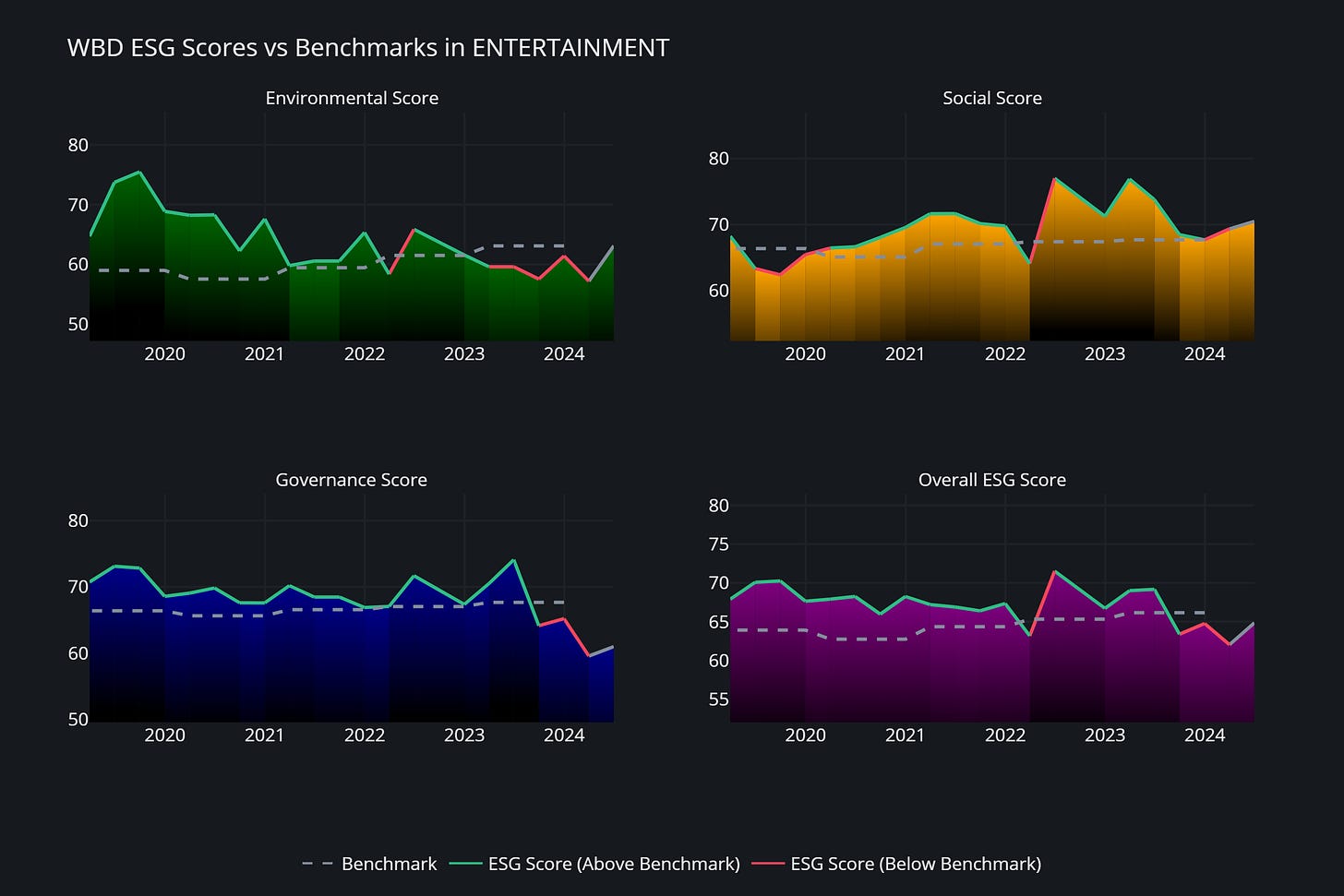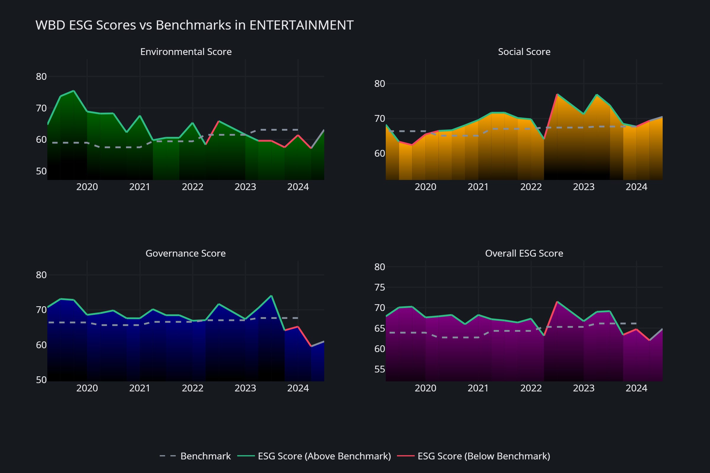 Governance Score: This is where things get ugly. We're seeing a sharp decline in 2024, with the score plummeting to 60.97, well below the benchmark. What's going on in the boardroom? The Warner-Discovery merger was bound to shake things up. It's likely impacting governance scores as the new entity finds its footing. The nosedive in governance scores is troubling. It could signal integration issues, leadership struggles, or both. This is something investors need to watch closely.