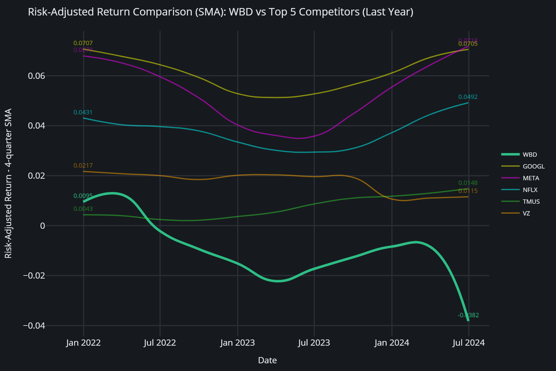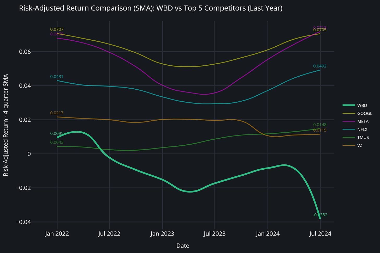 Risk-Adjusted Return: It has been negative since 2022. The sector, meanwhile, is sitting at a positive 0.029. WBD is paying for the privilege of taking risks while everyone else is getting paid. The fierce competition in streaming might be eating into margins. Are they spending too much on content without the subscriber growth to show for it?